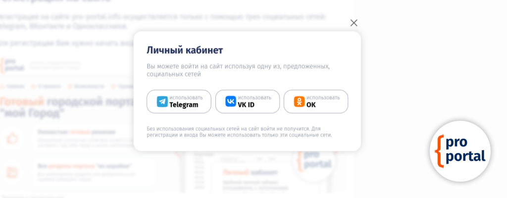 Регистрация на сайте pro-portal.info осуществляется только с помощью трех социальных сетей: Telegram, ВКонтакте и Одноклассники.