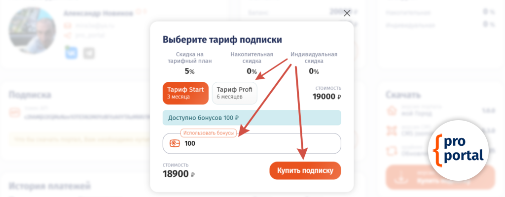 Личный кабинетНа следующем шаге Вам нужно выбрать тарифный план, если есть бонусы, Вы можете потратить их и купить подписку.