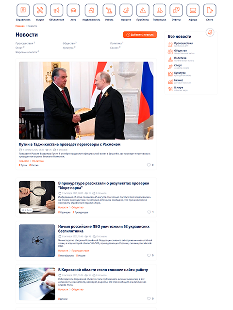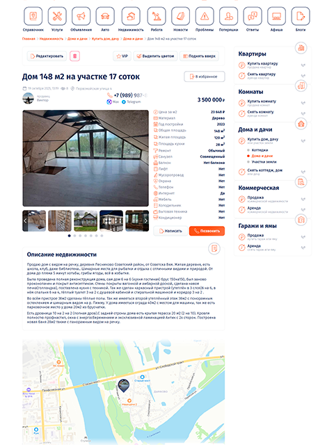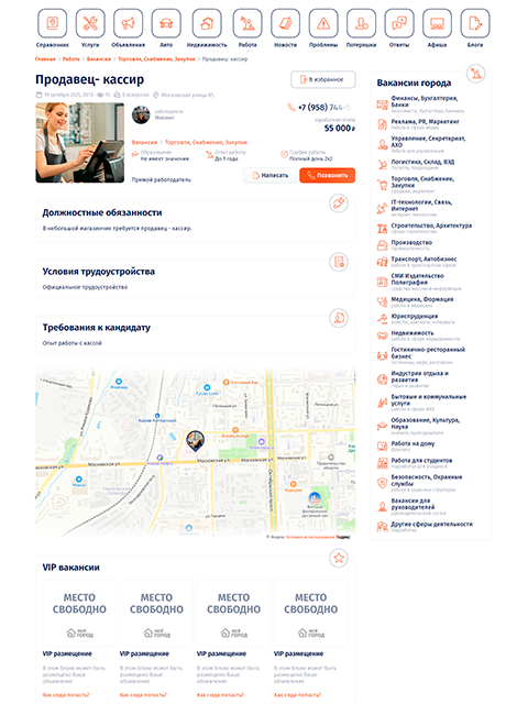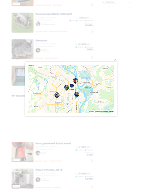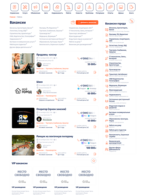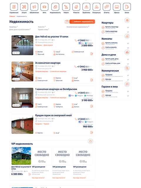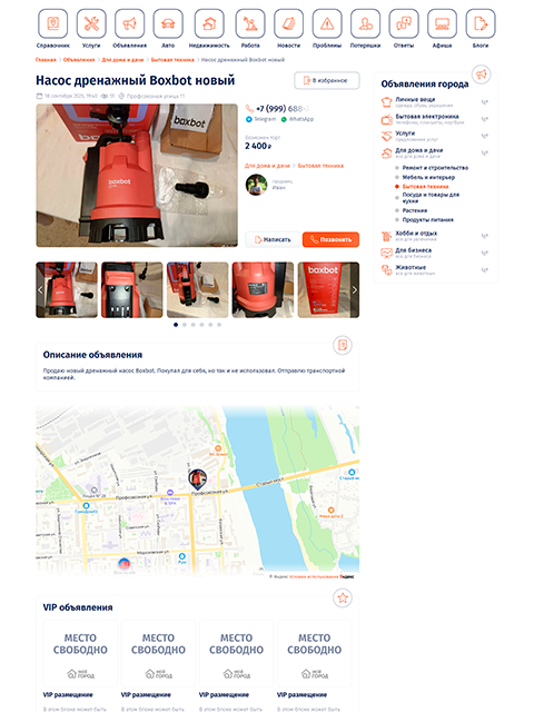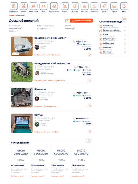 Простая, удобная и функциональная в использовании, для пользователей, доска объявлений, с помощью которой любой пользователь может добавить свою услугу или товар на страницы портала. Объявления так же отображаются на общей карте города.
