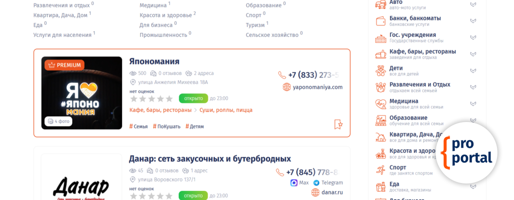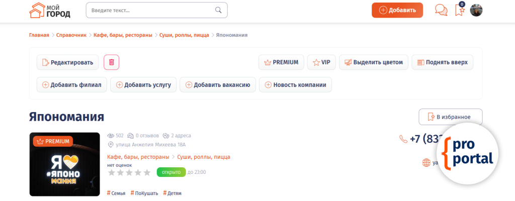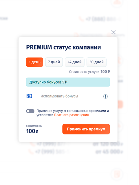 Применяя PREMIUM статус компании, компания закрепляется вверху списка, так же выделяется рамкой и помечается бейджем PREMIUM.
