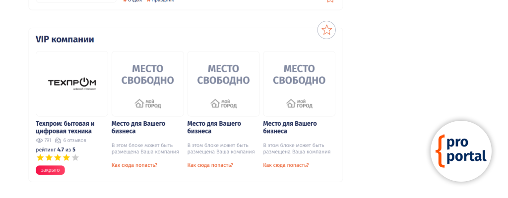 Бейдж VIP статусаТак же компания или объявление появляется в специальном блоке VIP компании или VIP объявлении. Этот блок отображается во всех категориях своего раздела, а так же во всех компаниях или объявлениях.