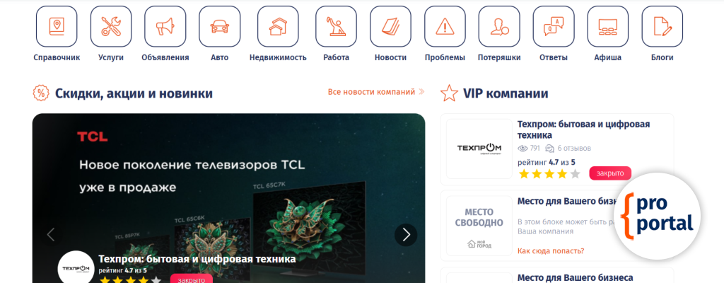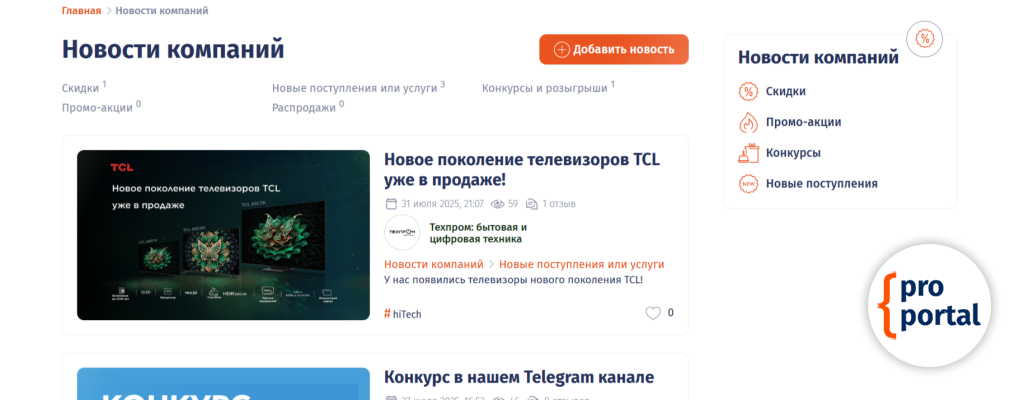 Добавление новостей компаний доступно только для раздела Каталог организаций. Любая компания, платно, может добавить любую новость: акции, скидки, конкурсы, новые поступления итак далее. После добавления новость компании попадает в специальный раздел портала Новости компании.
