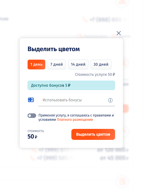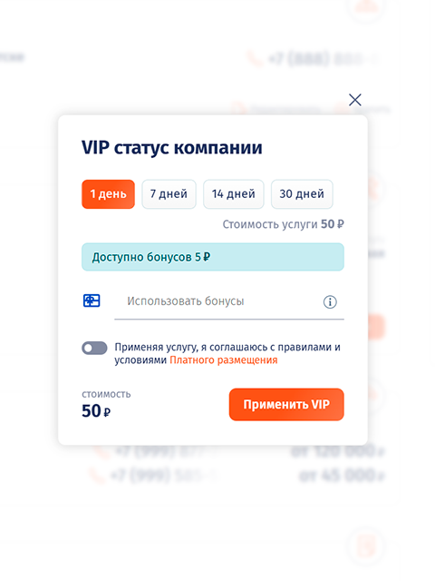 Эта платная функция доступна во всех 7-ми разделах портала и позволит выделить компанию или объявление в общих списках каталога.