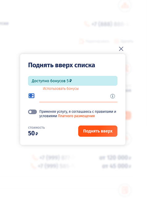Эта платная функция так же может быть использована во всех 7-ми разделах портала. Используя данную функцию, пользователь может поднять вверх списка каталога свою компанию или объявление.