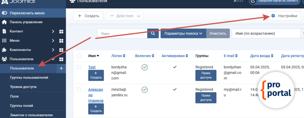 Основные настройки регистрации находятся в настройках пользователей. Что бы открыть их переходим в Пользователей и открываем Настройки в правом верхнем углу.