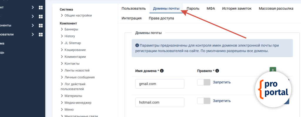 Активация пользователяНа вкладке Домены почты, можно ограничить/запретить регистрацию с определенных доменов. Например, gmail.com