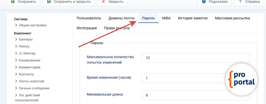 Домены почтыНа вкладке Пароль, можно изменить параметры сложности пароля.