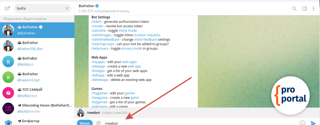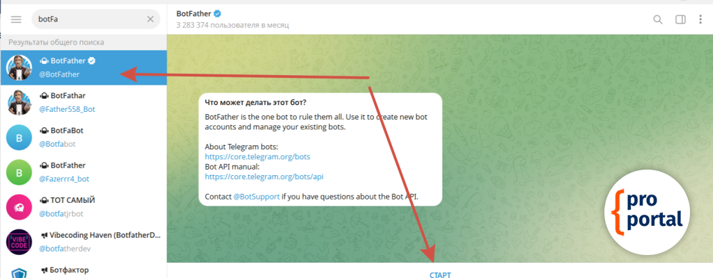 Переходим в приложение Telegram и открываем бота @botFather. и нажимаем Старт.