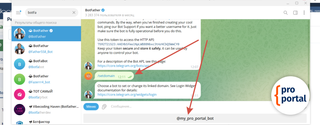 Имя и логин ботаПосле этого Вы получите токен, скопируйте его в буфер. Но этого еще недостаточно. Нужно еще добавить боту домен. Для этого вводим команду /setdomain и выбираем нашего бота.