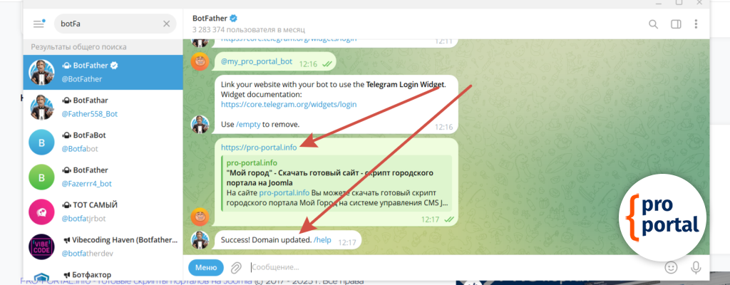 /setdomainИ далее вводим ссылку на Ваш сайт, после чего получим сообщение, об успешном добавлении домена к нашему боту.