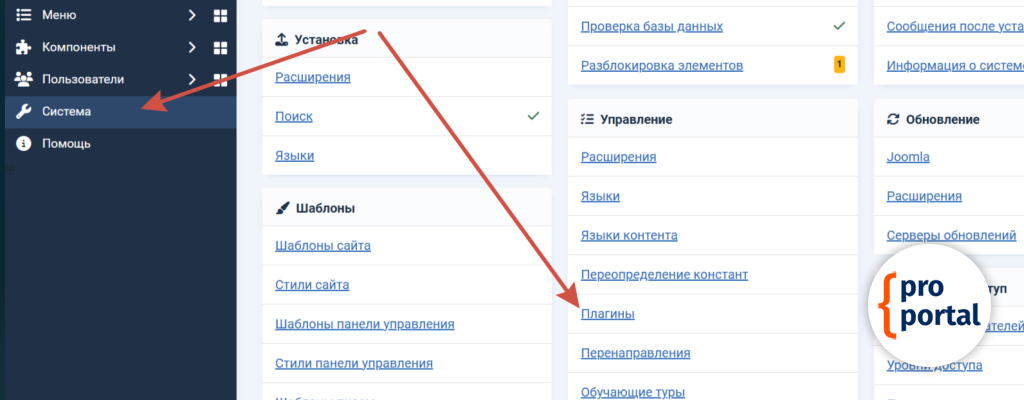 После создания бота, переходим в панель управления порталом, открываем Система/Плагины.