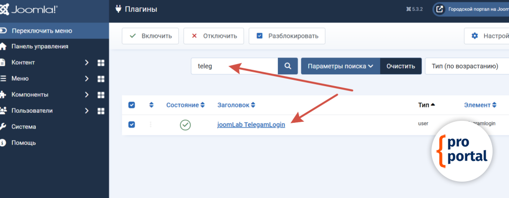 ПлагиныНаходим и открываем плагин joomLab TelegamLogin