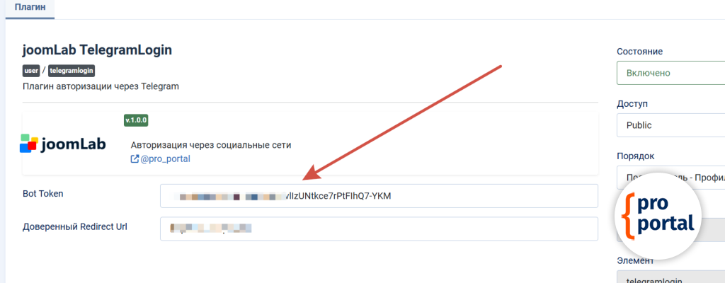 joomLab TelegamLoginВ настройках плагина вводим Bot token, который мы скопировали в буфер ранее и Сохраняем.