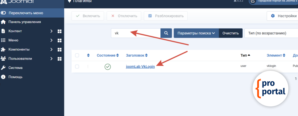ПлагиныНаходим плагин joomLab VkLogin и открываем его для редактирования.