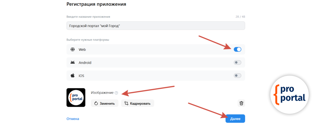 Создание приложенияНа следующем этапе вводим Название приложения, тип приложения выбираем Web, а так же добавляем иконку приложения.