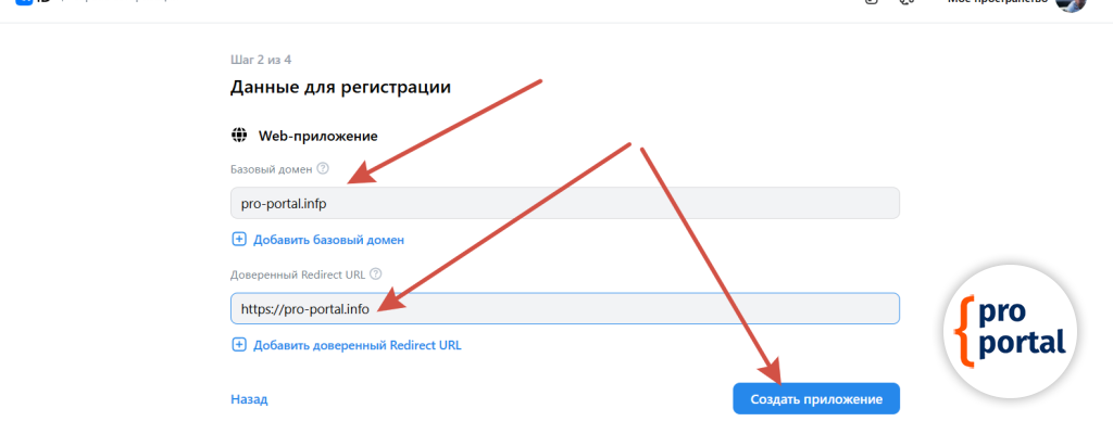 Название приложенияДальше необходимо указать Базовый домен (без протокола https://) и Доверенный редирект URL (с протоколом https://).