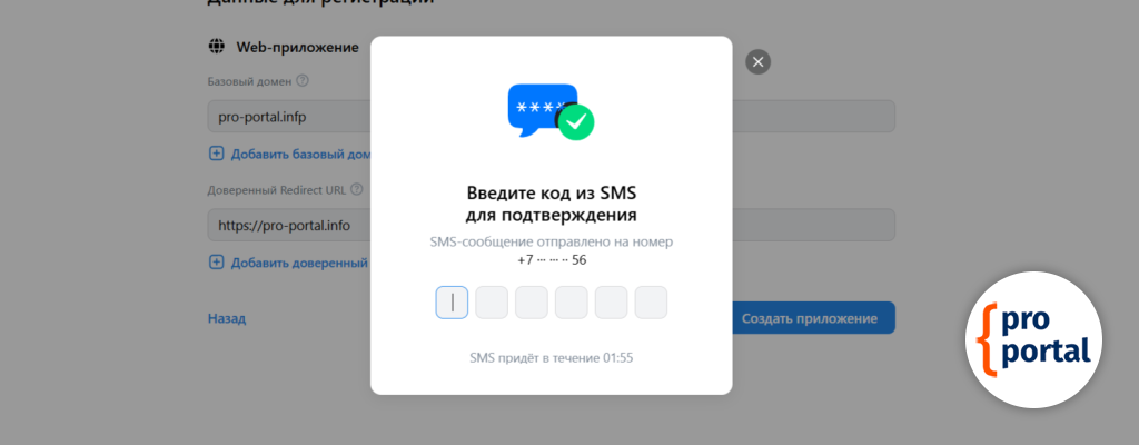 Данные для регистрацииПодтверждаем создание приложения кодом из СМС.