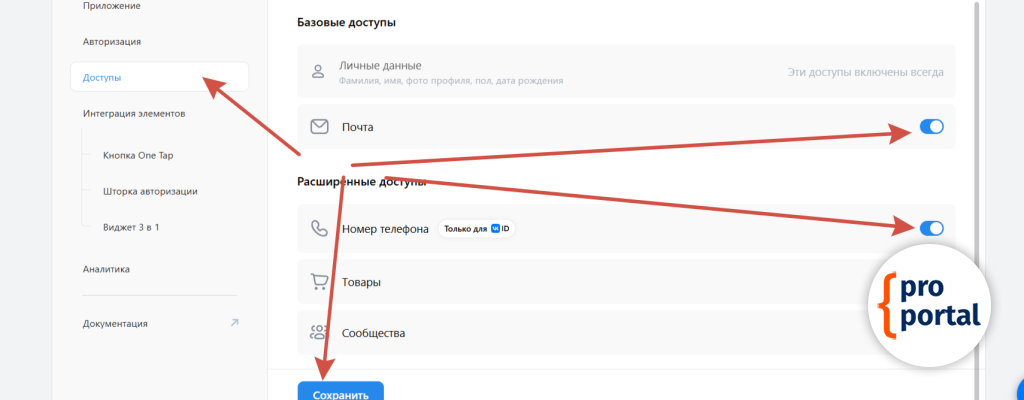 Настроить позжеДалее переходим к Доступам и добавляем к стандартным Почту и Номер телефона. Эти доуступы приложение будет получать при авторизации пользователя на сайте.