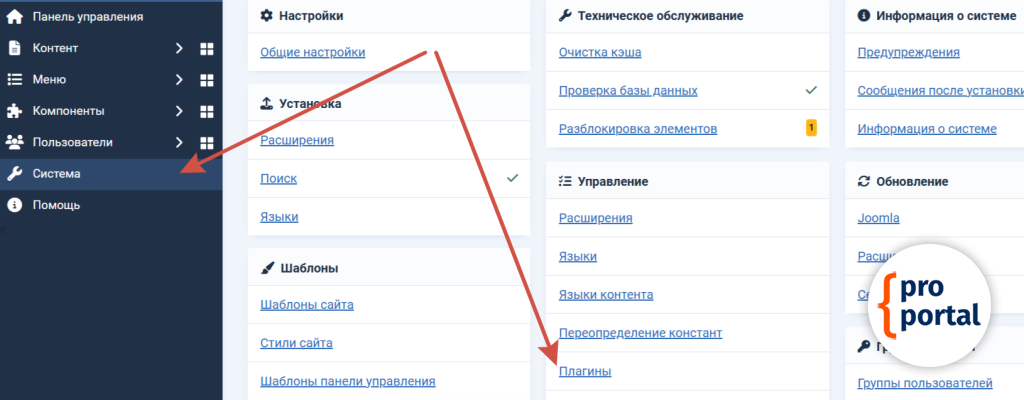 После получения ID приложения, переходим в панель управления порталом, далее Система/Плагины.