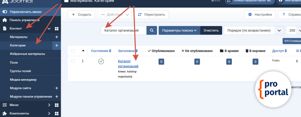 Для этого, в панели управления сайта, необходимо перейти Контент/Категории, поиском найти необходимую категорию и открыть ее для редактирования.
