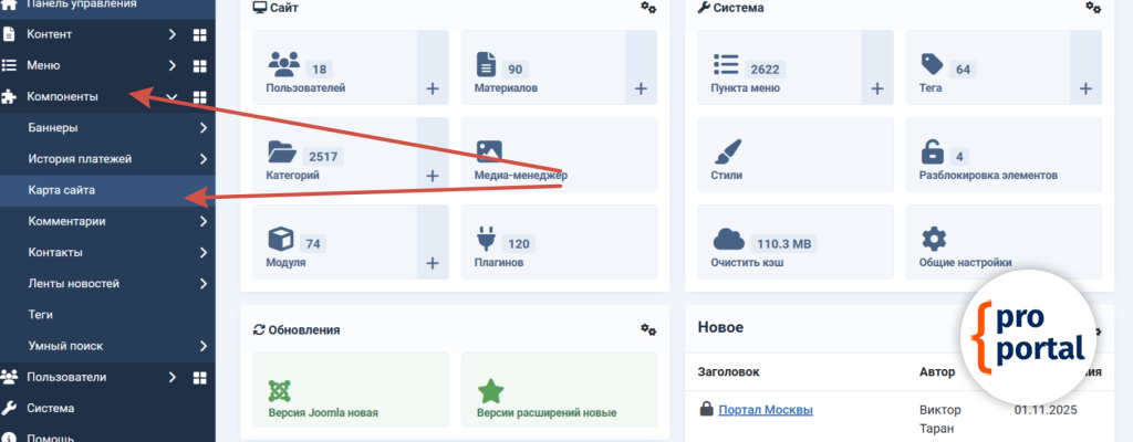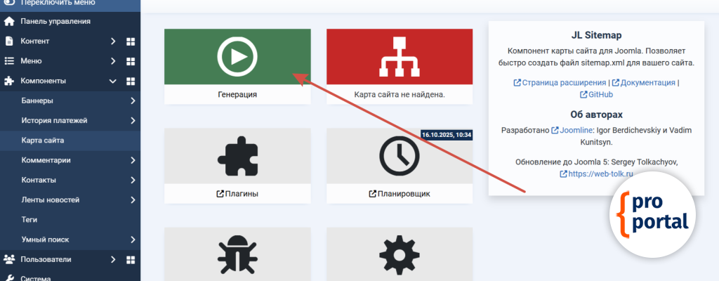 Карта сайта создается очень просто. Для ее создания перейдите Компоненты/Карта сайта