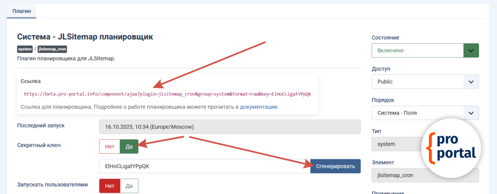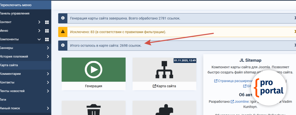 Генерация карты сайтаПосле успешной генерации, Вы увидите сообщение с количеством ссылок в карте сайта. Это значит, что карта сайта создана и доступна по ссылке https:://ваш_домен/sitemap.xml