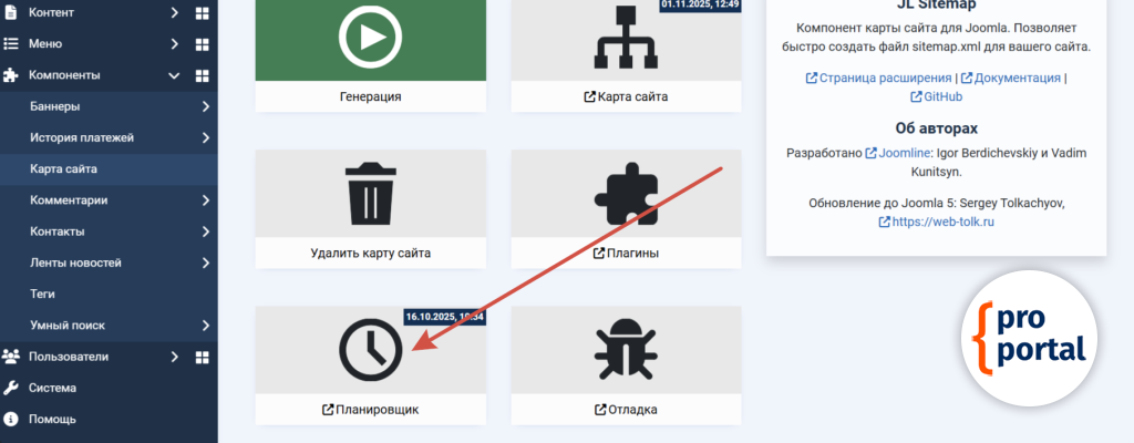 Что бы автоматизировать обновление карты сайта, перейдите в Планировщик