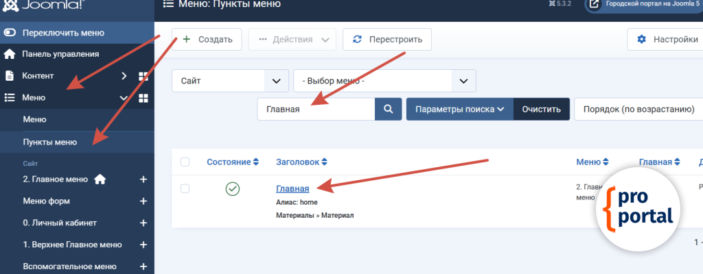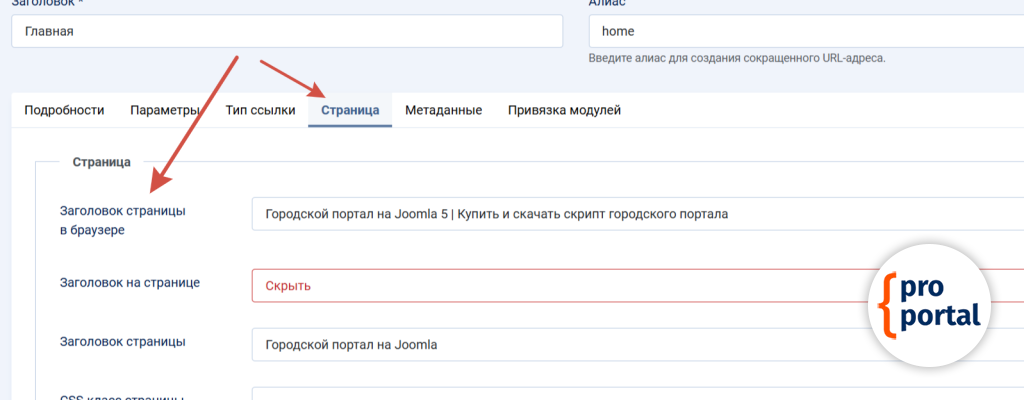 Заголовки у любых пунктов меню меняются одинаково, независимо от разделов портала. Я покажу, как поменять заголовок у главной страницы.