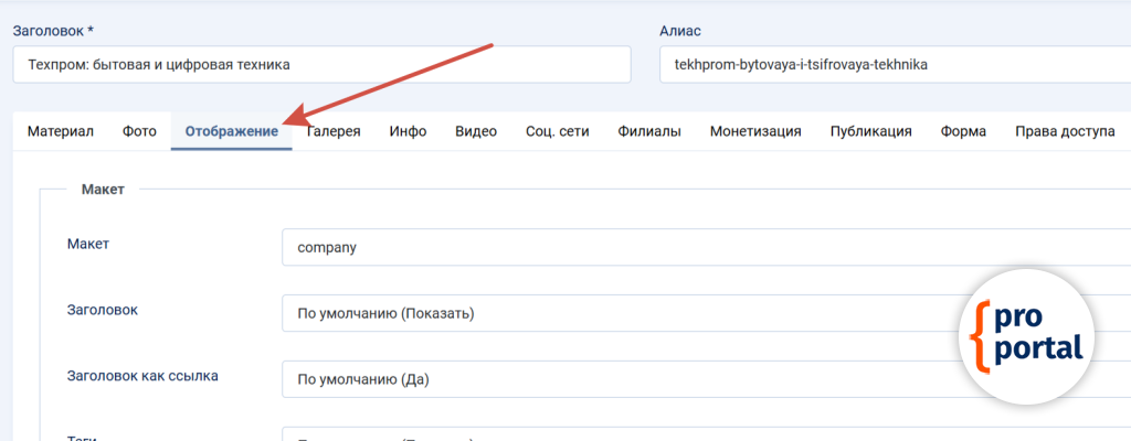 В случае, когда страница не имеет пункта меню, например, это компания, услуга, объявление, новость и так далее, то заголовок меняется в материале.