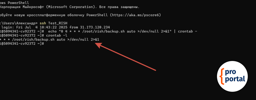 echo "46 4 * * * /root/rish/backup.sh auto >/dev/null 2>&1" | crontab -Эта команда будет выполнять бэкап каждый день в 4:46.