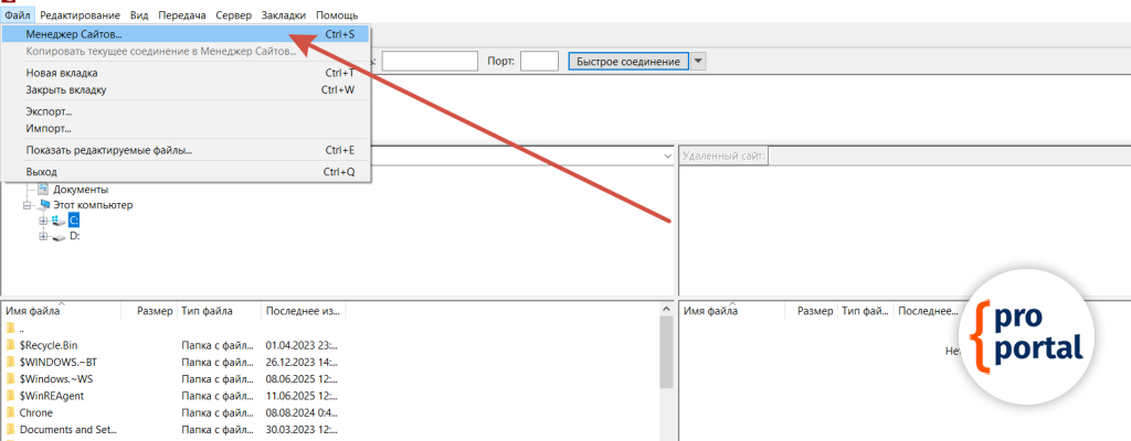 Открываем клиент, переходим Файл/Менеджер сайтов.