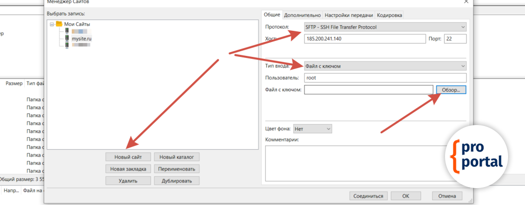 Менеджер сайтовСоздаем новый сайт. Выбираем протокол SFTP - SSH File Transfer Protocol, вводим IP адрес, порт, тип входа выбираем Файл с ключом, вводим логин пользователя (обычно это root). Далее нажимаем Обзор для выбора файла ключа.