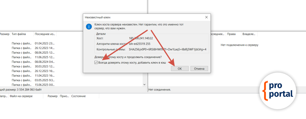 СоединениеПри первом соединении, Вы увидите сообщение Неизвестный ключ, ставим галочку Всегда доверять этому хосту и жмем ОК.