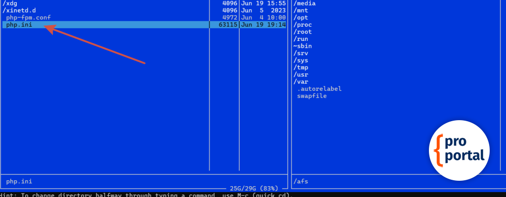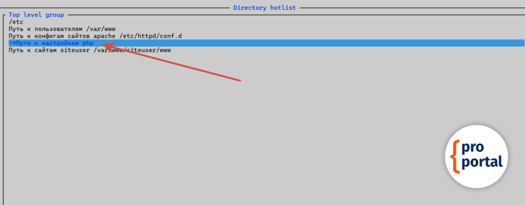Midnight CommanderПосле открытия MC нажимаем сочетание клавиш Ctrl + \ и, в всплывающем окне, выбираем Пути к настройкам php.
