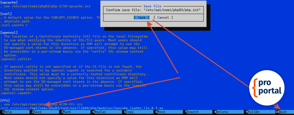 zend_extension=/opt/remi/php83/root/usr/lib64/php/modules/ioncube_loader_lin_8.3.soПосле этого сохраняем, нажимая клавишу F2 (соглашаемся с сохранением) и выходим, используя клавишу F10.