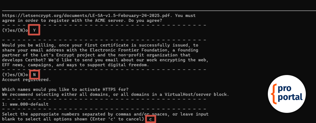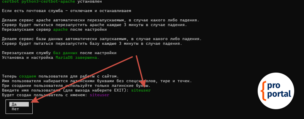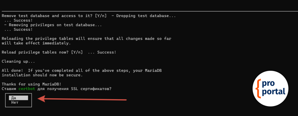 MariaDBНа следующем этапе устанавливаем certbot для получения SSL - сертификатов. Так же выбираем Да и жмем Enter.