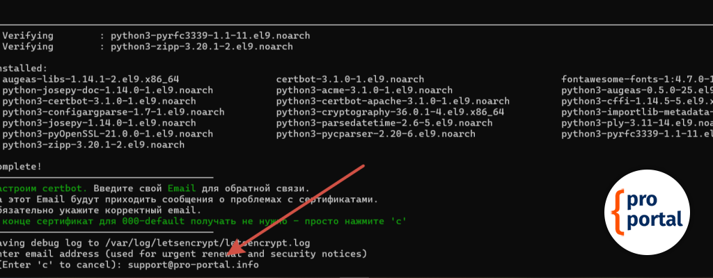 Устанавливаем certbotСледующим шагом указываем корректный, действующий e-mail. На эту почту будут приходить уведомления о сертификатах.