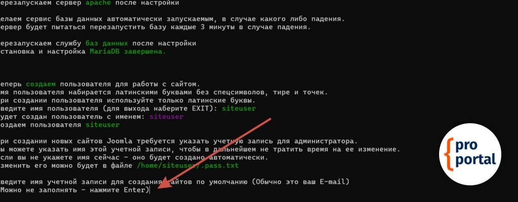 Создаем пользователяСледующим шагом предлагается указать учетную запись для создания сайтов, можно указать, я пропускаю и просто жму Enter