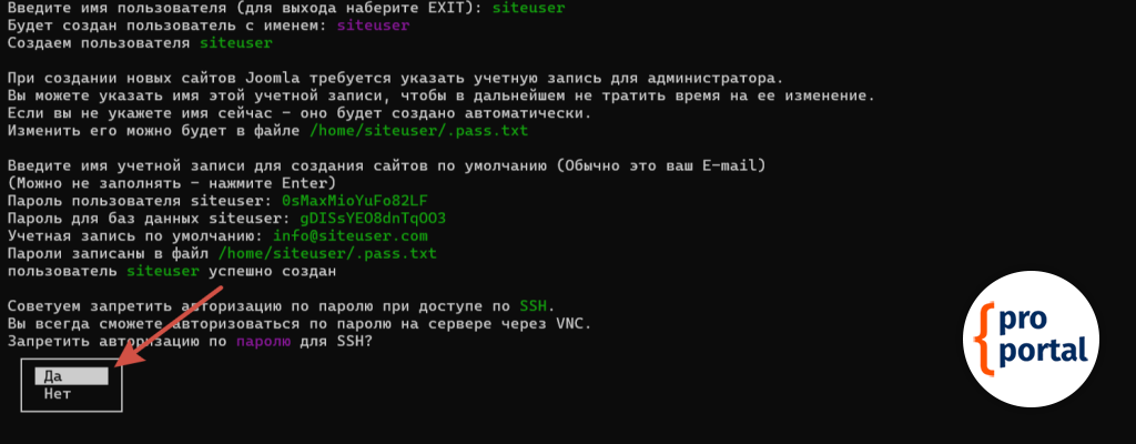 Очень внимательно отнеситесь к следующим действиям, что бы не переустанавливать все с начала!Следующим шагом, установщик предлагает нам отключить авторизацию по паролю - соглашаемся и выбираем Да, жмем Enter.