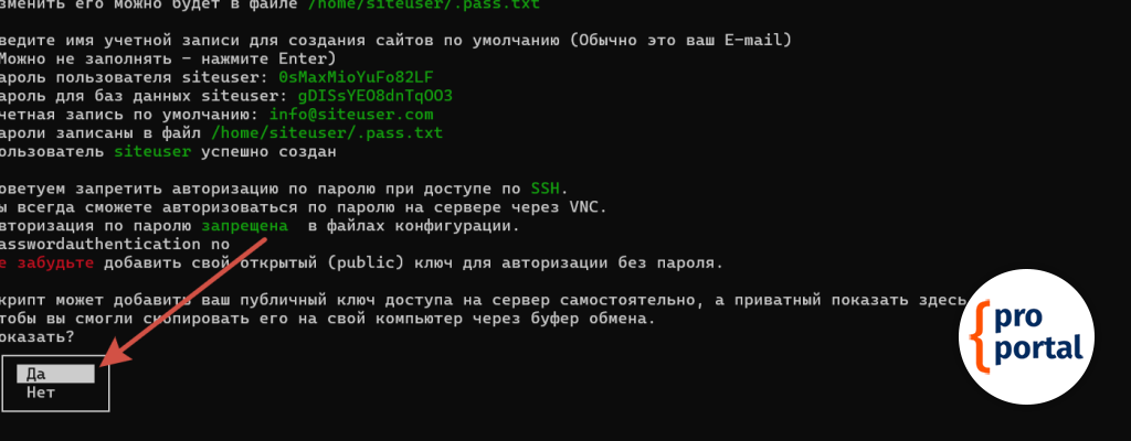 Запрет авторизации по паролю SSHНа следующем шаге, установщик предлагает автоматически добавить публичный ключ на сервер, а приватный показать на экране, для того, что бы Вы его скопировали - соглашаемся, выбираем Да и жмем Enter