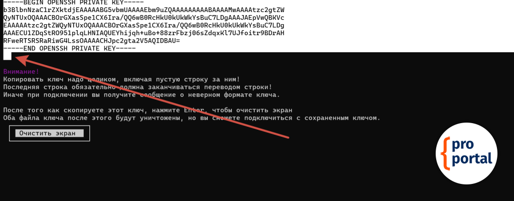 Автоматическое создание ключейПосле этого Вы увидите приватный ключ, с помощью которого Вы будете подключаться к серверу. Этот ключ нужно скопировать (Ctrl+Insert)
