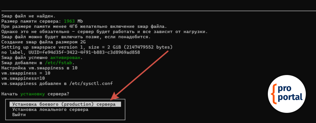 SWAP файлДалее установщик предложит выбрать режим сервера, выбираем установку боевого сервера.