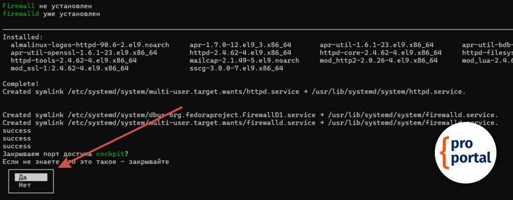 Установка боевого сервераДалее процесс установки продолжится и на следующем этапе, установщик предложит закрыть порт доступа cockpit. Закрываем - выбираем Да и жмем Enter