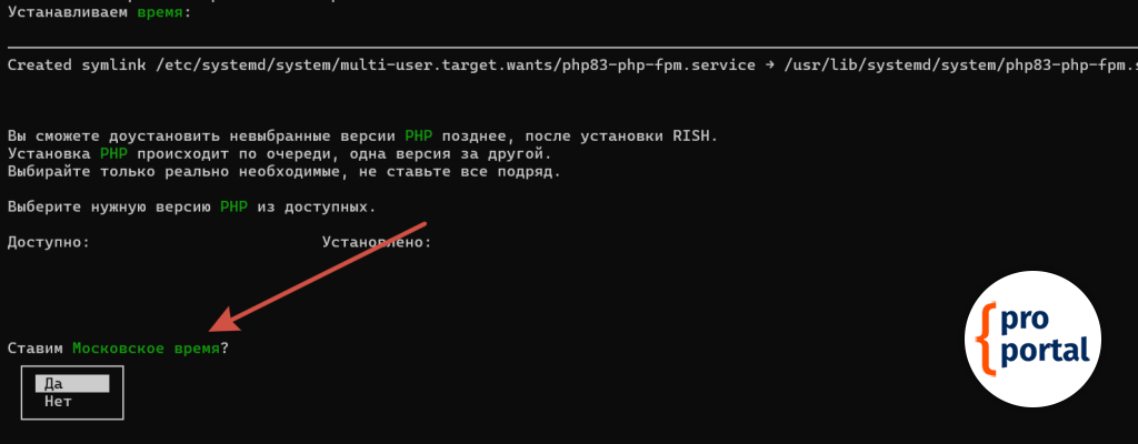 Завершаем выбор версии PHPДалее выбираем время Московское или нет